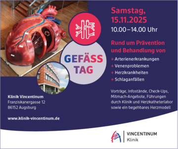 Besuchen Sie uns am Samstag, 15.11.25 von 10 -14 Uhr am Gefäßtag. Wir bieten Informationen und Aktivitäten rund um Prävention und Behandlung von Arterienerkrankungen, Venenproblemen, Herzkrankheiten und Schlaganfall.