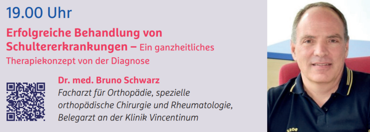 Anmeldung für den Vortrag "Erfolgreiche Behandlung von Schultererkrankungen - Ein Ganzheitliches Therapiekonzept von der Diagnose bis zur Reha" von Belegarzt Dr. med. Bruno Schwarz am 18.11.2024 um 19 Uhr.